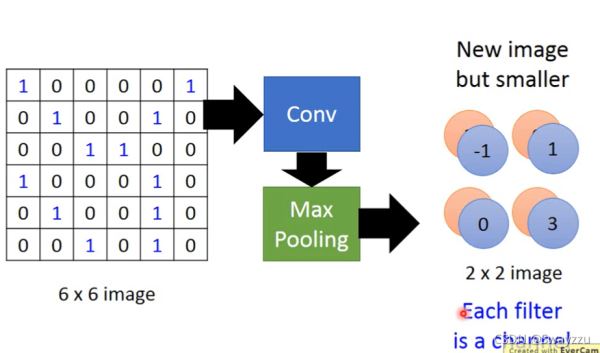 如下圖所示,輸入數(shù)據(jù)原本是6*6,通過卷積層之后變成4*4,通過池化層之后變成2*2。對于實際的圖片來說,維度可能很高,因此卷積層,池化層可以多次進(jìn)行。