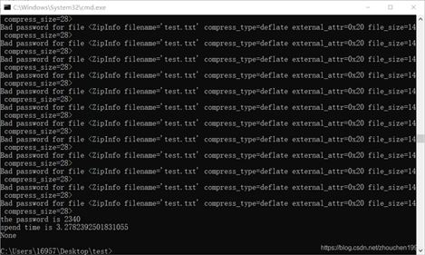 這里情況密碼組合太多,為了防止內(nèi)存溢出,改用迭代器。這種情況費時很久,可以閑來無事掛著腳本。這里再次壓縮文件,密碼為python。
