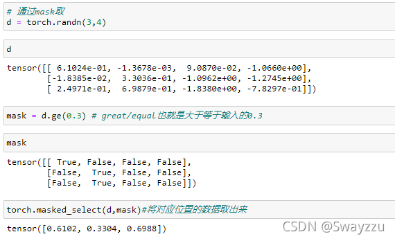 需要先根據(jù)數(shù)據(jù)生成一個(gè)mask,比如挑選出大于等于0.3的數(shù),此時(shí)會(huì)得到一個(gè)和數(shù)據(jù)相同形狀的,滿足條件位置是1,不滿足條件的位置是0的一個(gè)mask,通過(guò)masked_select可以選出數(shù)據(jù)。