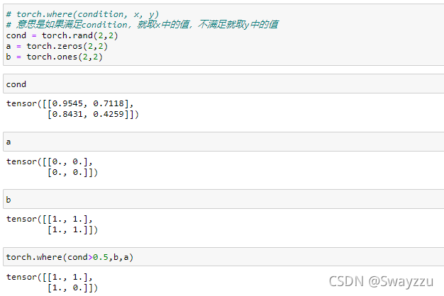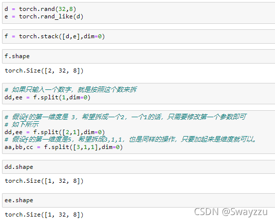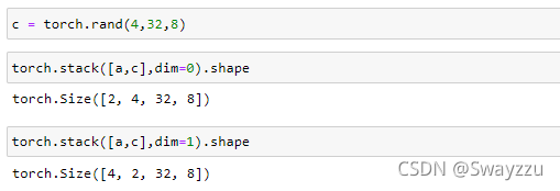 例:此處創(chuàng)建一個和a一樣的tensor,按照某一維度進行stack,就會在堆疊的維度前面,生成一個新的維度,用以進行選擇,比如新生成了一個2維,就可以通過0,1進行選擇。具體是什么意義,取決于實際的問題。