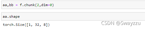 比如下面的例子,原來維度是[2,32,8],chunk參數(shù)傳入2,就需要拆成2個,則2/2=1,最終每一個的維度變?yōu)閇1,32,8]。
