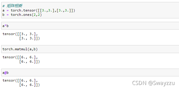 注意,*就是元素與元素相乘,而矩陣相乘可以用以下兩種:torch.matmul,@