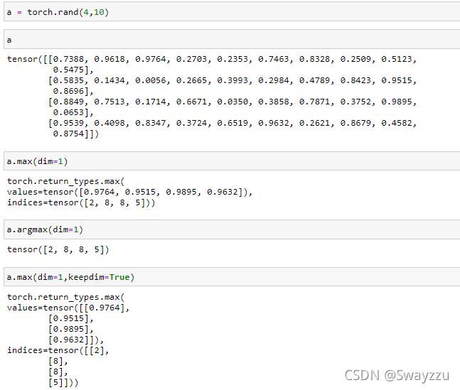注意這里的dim,a的形狀是[4,10],求最大值時,如果設(shè)置dim=1,也就是列,個人理解,意思是結(jié)果的維度需要是列,那么就是把整行的數(shù)值進行計算找最大值,最后返回一個列作為結(jié)果。