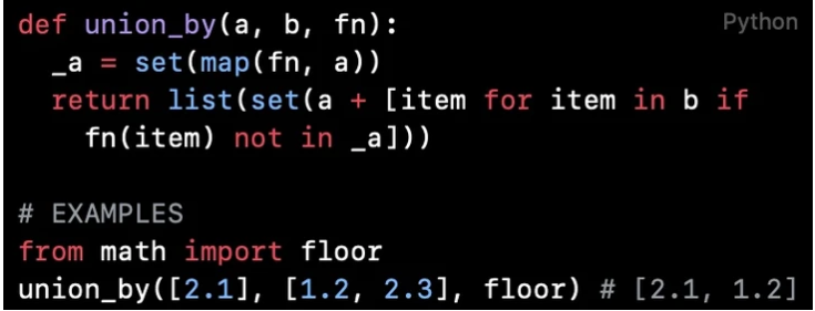 union_by函數(shù)接收兩個列表和一個過濾條件函數(shù)。將提供的函數(shù)應(yīng)用于兩個列表中的每個元素后,返回一個新的列表,包含所有存在于兩個列表的不重復(fù)的元素。