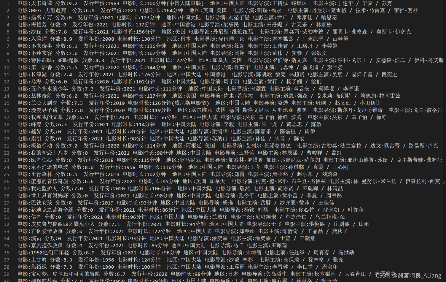 "電影:{}\t分?jǐn)?shù):{}\t發(fā)行年份:{}\t電影時長:{}\t地區(qū):{}\t電影導(dǎo)演:{}\t電影主演:{}\n".format(