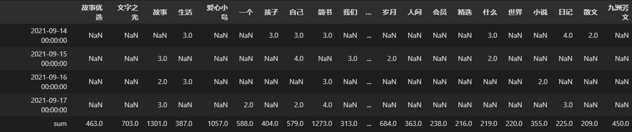 使用以下代碼,統(tǒng)計所有列數(shù)值的總和,即每個關鍵詞在全部數(shù)據(jù)中出現(xiàn)的次數(shù),存儲到名為 sum 的行中:
