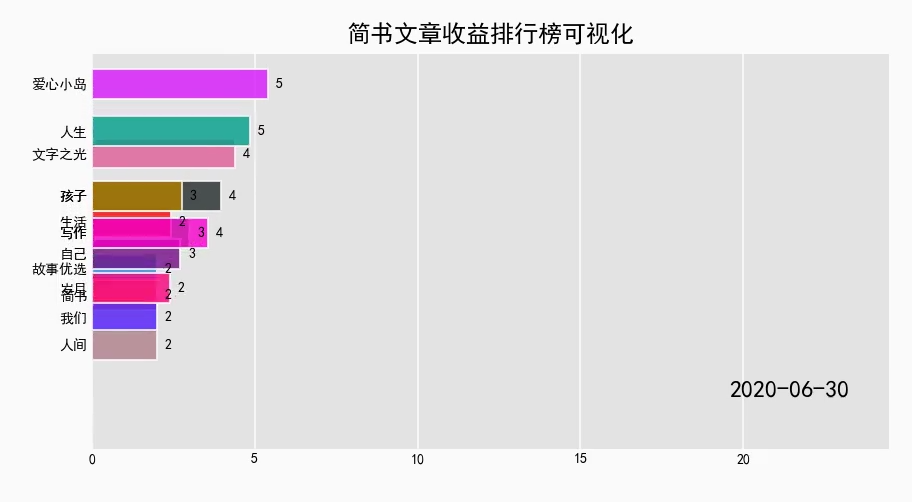 bcr.bar_chart_race(smaller_df, steps_per_period=30, period_length=1500, title="簡書文章收益排行榜可視化", bar_size=0.8, fixed_max=10, n_bars=10)