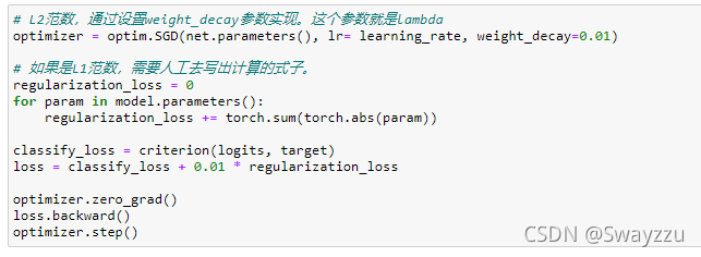 直接在優(yōu)化器中,設(shè)置weight_decay即可。優(yōu)化器中,默認(rèn)的是L2范式,因此填入的參數(shù)就是lambda。想要使用L1范式的話,需要手動(dòng)寫出代碼。