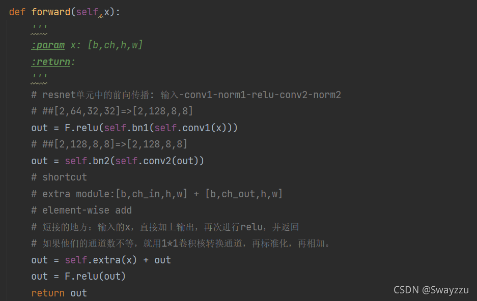 一個block中,有兩個卷積層,之后的輸出還要和輸入進行相加。因此一個block的前向流程如下: