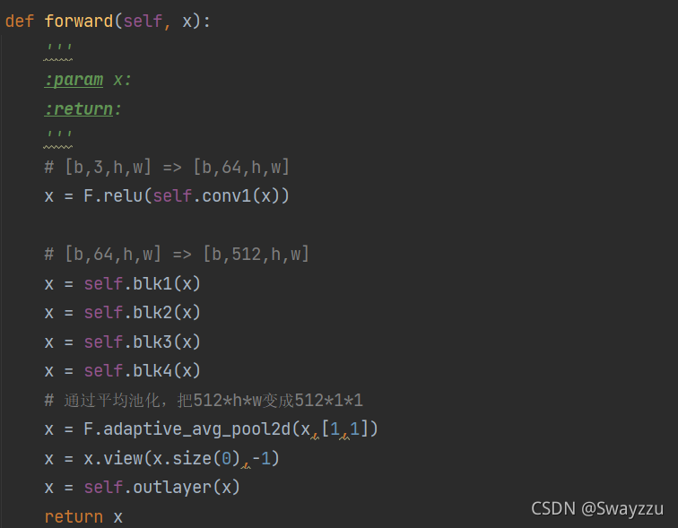 在初始化的時候,定義好所需要使用的模塊,根據(jù)上面定義好的殘差模塊,調用即可。在這里使用了4次殘差模塊,將通道數(shù)從輸入的3(也就是RGB),變成了512通道。也就是最終提取的高級特征。提取完特征,直接輸入給Linear方法,得到圖片在10種圖片類型上的結果,用于預測以及損失值的求解。
