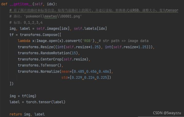 上面幾步是準(zhǔn)備工作,接下來定義的__getitem__是為了能夠使train_loader = DataLoader()這一語句實(shí)現(xiàn)。在這里面直接將數(shù)據(jù)進(jìn)行我們希望進(jìn)行的轉(zhuǎn)換。比如大小、旋轉(zhuǎn)、裁剪等。