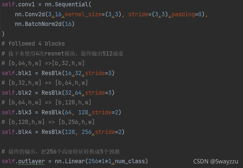 主要的修改部分是ResNet18之中的resblock模塊。因?yàn)槲覀兿M斎氲氖?通道,224*224的圖片,因此在這里對通道,步長進(jìn)行一定的修改,并進(jìn)行測試,成功之后便可以進(jìn)行訓(xùn)練了。