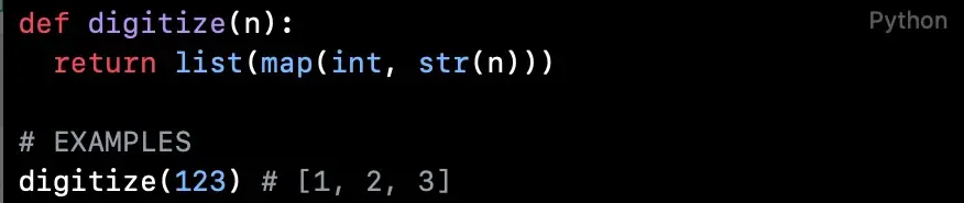 def digitize(n): return list(map(int, str(n))) # EXAMPLES digitize(123) # [1, 2, 3]