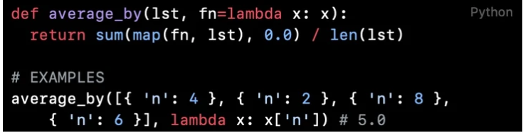 該函數(shù)用于在列表中求取平均數(shù)。該代碼片段中主要使用了lambda表達式和map函數(shù)。該函數(shù)的主要邏輯是使用lambda表達式和map函數(shù)提取由待計算的數(shù)值組成的迭代器,然后使用sum函數(shù)計算列表的和,再除以列表長度。