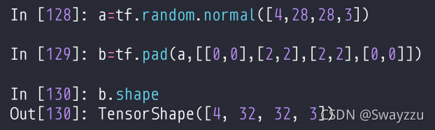 給圖片進(jìn)行padding的時(shí)候,通常數(shù)據(jù)的維度是[b,h,w,c],那么增加兩行,兩列的話,是在中間的h和w增加: