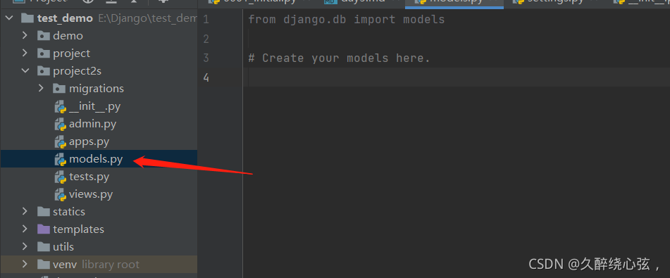 每個應用的模型都會被編寫到models.py文件下,如圖,創(chuàng)建項目時會自動引入models模塊。