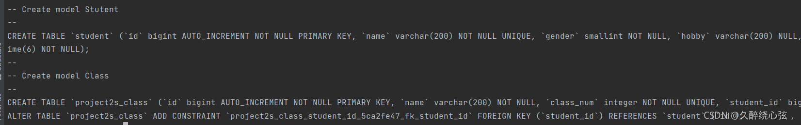 django底層是用sql實現(xiàn)的,查看執(zhí)行遷移生成的sql命令如下: