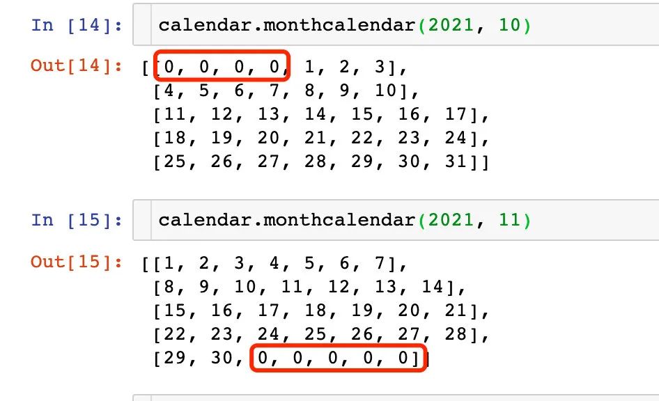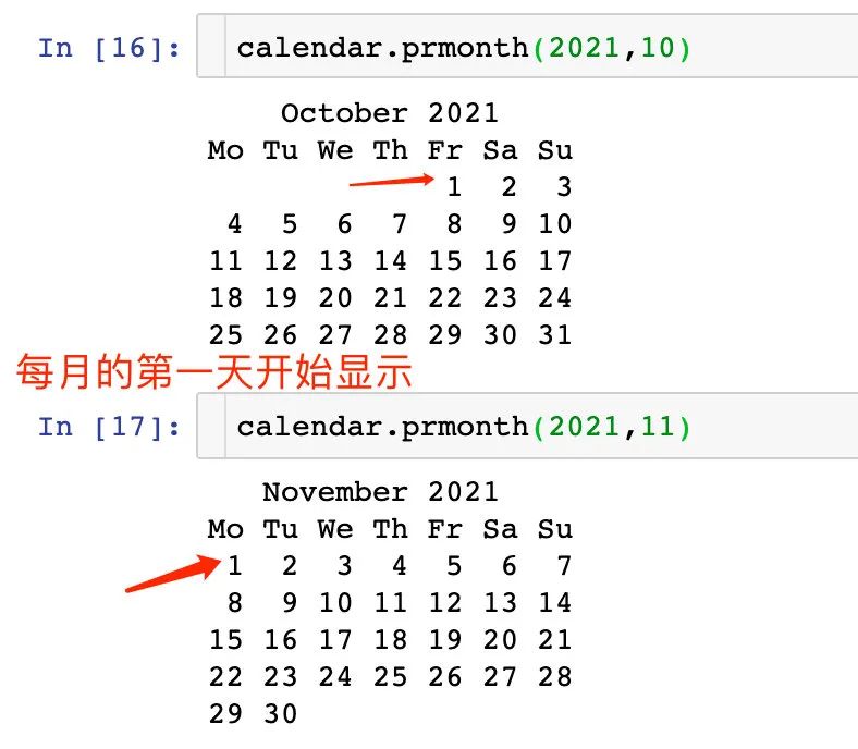 10月份的第一天是星期五,11月份的第一天是星期一(0代表周一)