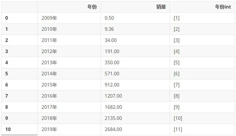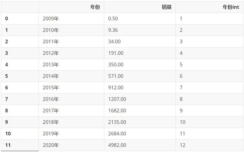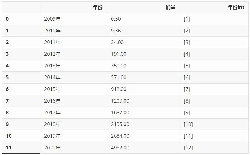 從網(wǎng)上搜集來(lái)歷年淘寶天貓雙十一銷(xiāo)售額數(shù)據(jù),單位為億元,利用 Pandas 整理成 Dataframe,又添加了一列'年份int',留作后續(xù)的計(jì)算使用。