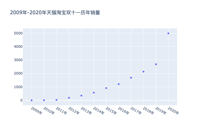 # 散點(diǎn)圖 import plotly as py import plotly.graph_objs as go import numpy as np year = df[:]['年份'] sales = df['銷(xiāo)量'] trace = go.Scatter( x=year, y=sales, mode='markers' ) data = [trace] layout = go.Layout(title='2009年-2020年天貓?zhí)詫氹p十一歷年銷(xiāo)量') fig = go.Figure(data=data, layout=layout) fig.show()