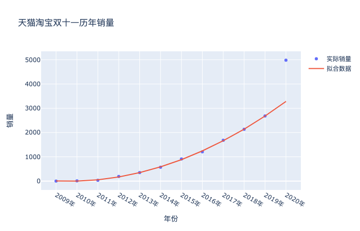 但如果你用同樣的方法去做預(yù)測(cè)2020年的時(shí)候,發(fā)現(xiàn)預(yù)測(cè)是3282億,實(shí)際卻到了 4982億。原來(lái)2020改了規(guī)則,實(shí)際上統(tǒng)計(jì)的是11月1到11日的銷(xiāo)量,理論上已經(jīng)不能和歷史數(shù)據(jù)合并預(yù)測(cè),但咱們就為了圖個(gè)樂(lè),主要是為了練習(xí)一下 Python 的多項(xiàng)式回歸和可視化繪圖。