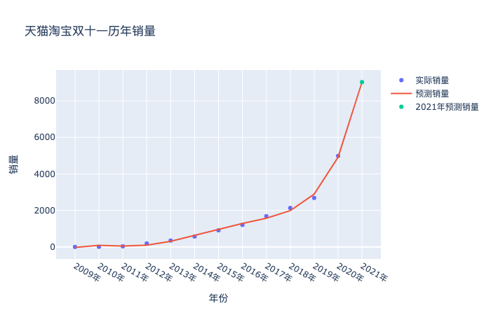 # 散點(diǎn)圖 import plotly as py import plotly.graph_objs as go import numpy as np year = list(df['年份']) sales = df['銷(xiāo)量'] trace1 = go.Scatter( x=year, y=sales, mode='markers', name="實(shí)際銷(xiāo)量" # 第一個(gè)圖例名稱(chēng) ) XX_ = poly_reg.fit_transform(list(df['年份int'])+[[13]]) regr = LinearRegression() regr.fit(X_,list(df_2009_2019['銷(xiāo)量'])) trace2 = go.Scatter( x=list(df['年份']), y=regr.predict(XX_), mode='lines', name="擬合數(shù)據(jù)", # 第2個(gè)圖例名稱(chēng) ) data = [trace1,trace2] layout = go.Layout(title='天貓?zhí)詫氹p十一歷年銷(xiāo)量', xaxis_title='年份', yaxis_title='銷(xiāo)量') fig = go.Figure(data=data, layout=layout) fig.show()