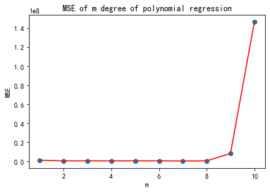 # 計(jì)算 m 次多項(xiàng)式回歸預(yù)測(cè)結(jié)果的 MSE 評(píng)價(jià)指標(biāo)并繪圖