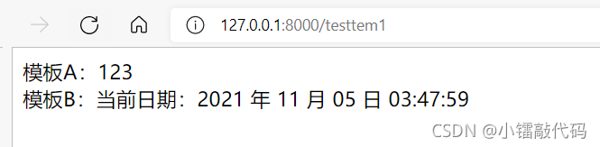 模塊testtem.html中使用了{(lán)%now%}標(biāo)簽獲得指定格式的當(dāng)前日期字符串。瀏覽器顯示渲染結(jié)果: