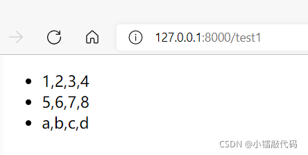 將上面的模板文件 test1.html中的for標(biāo)簽改為反向循環(huán)后,渲染結(jié)果(使用反向循環(huán)的渲染結(jié)果):