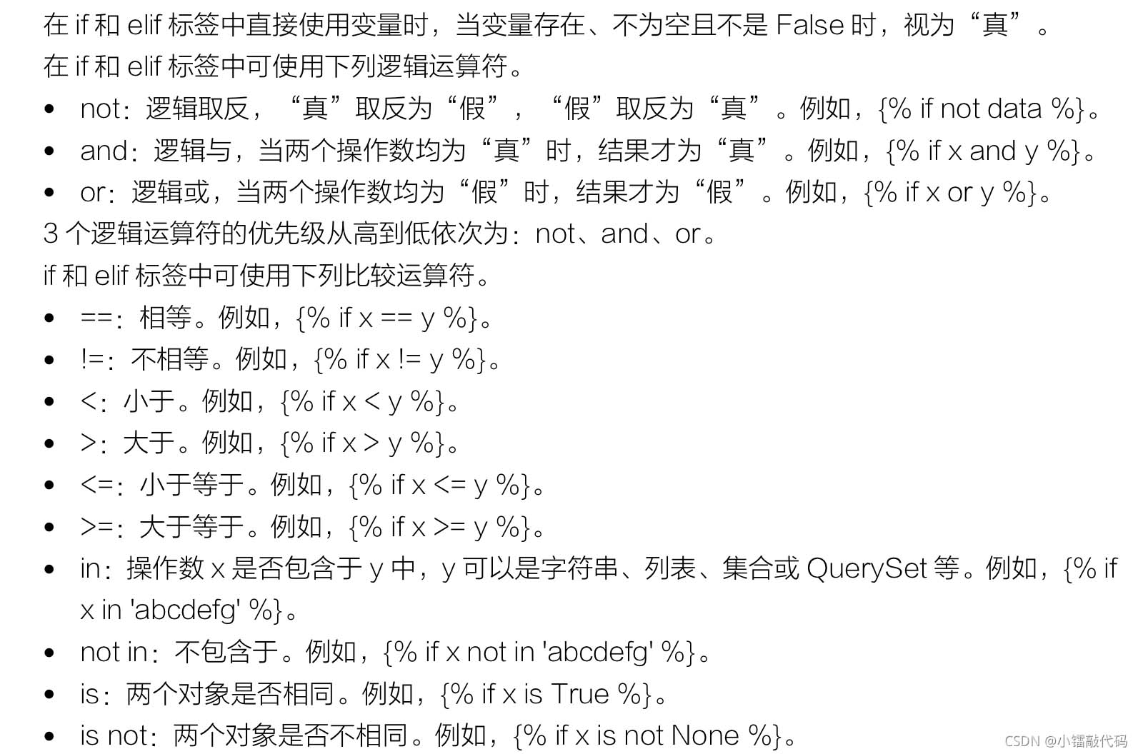 elif和else塊可以省略,elif塊可以有多個(gè)。Django按先后順序依次計(jì)算if和elif標(biāo)簽的變量,如果變量為“真”(及變量存在,不為空、且不是False),則輸出相應(yīng)的數(shù)據(jù)塊,且流程跳轉(zhuǎn)到endif標(biāo)簽后。如果沒(méi)有變量為“真”,則輸出else數(shù)據(jù)塊(如果else數(shù)據(jù)塊存在的話)