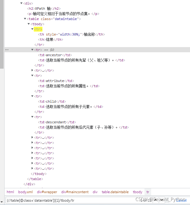 根據(jù)xpath定位到了tr,注意游覽器自動(dòng)生成了tbody,在python中要把自動(dòng)生成的tbody層級去掉。