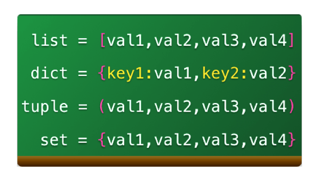 我們先從整體上來認(rèn)識一下這四種數(shù)據(jù)結(jié)構(gòu):從最容易識別的特征上來說,列表中的元素使用方括號擴(kuò)起來,字典和集合是花括號,而元組則是圓括號。其中字典中的元素是均帶有 ‘:' 的 key 與 value 的對應(yīng)關(guān)系組。