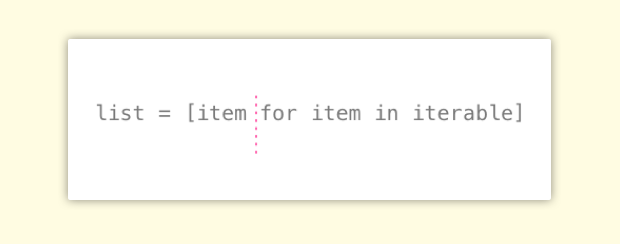 列表推導(dǎo)式的用法也很好理解,可以簡單地看成兩部分。紅色虛線后面的是我們熟悉的 for 循環(huán)的表達(dá)式,而虛線前面的可以認(rèn)為是我們想要放在列表中的元素,在這個(gè)例子中放在列表中的元素即是后面循環(huán)的元素本身。