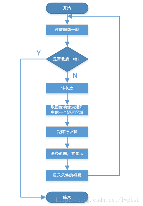 任務(wù)目標(biāo):攝像頭采集圖像(例如:480640),并對(duì)視頻流每一幀(灰度圖)特定矩形區(qū)域(48030)像素值進(jìn)行行求和,得到一個(gè)480*1的數(shù)組,用這480個(gè)數(shù)據(jù)繪制條形圖,即在逐幀采集視頻流并處理后“實(shí)時(shí)”顯示采集到的視頻,并“實(shí)時(shí)”更新條形圖。工作流程如下圖: