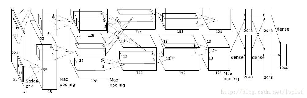 池化層使用Max pooling,此前CNN普遍使用平均池化,最大池化避免了平均池化的模糊化效果。且提出讓步長小于池化核的尺寸,這樣池化層的輸出之間會有重疊和覆蓋,提升了特征的豐富性。