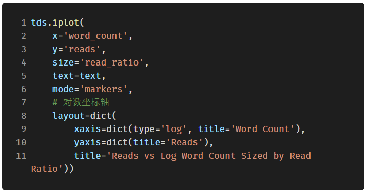 接下來(lái)我們要玩點(diǎn)復(fù)雜的:對(duì)數(shù)坐標(biāo)軸。我們通過(guò)指定 plotly 的布局(layout)參數(shù)來(lái)實(shí)現(xiàn)這一點(diǎn)(關(guān)于不同的布局,請(qǐng)參考官方文檔 https://plot.ly/python/reference/ ),同時(shí)我們把點(diǎn)的尺寸(size參數(shù))和一個(gè)數(shù)值變量 read_ratio (閱讀比例)綁定,數(shù)字越大,泡泡的尺寸也越大。