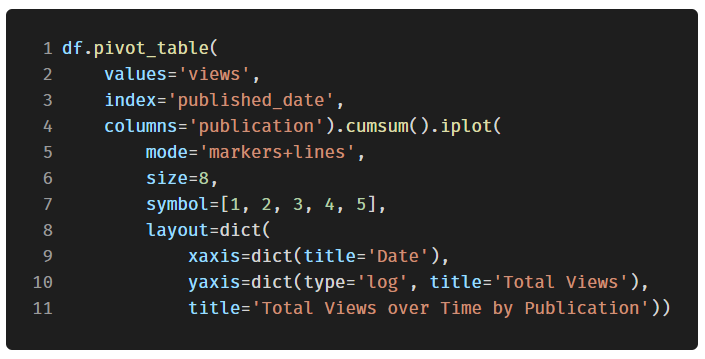 以我在“Towards Data Science”網(wǎng)站上發(fā)表的文章數(shù)據(jù)為例,讓我們以發(fā)布時(shí)間為索引構(gòu)建一個(gè)數(shù)據(jù)集,看看文章熱度的變化情況: