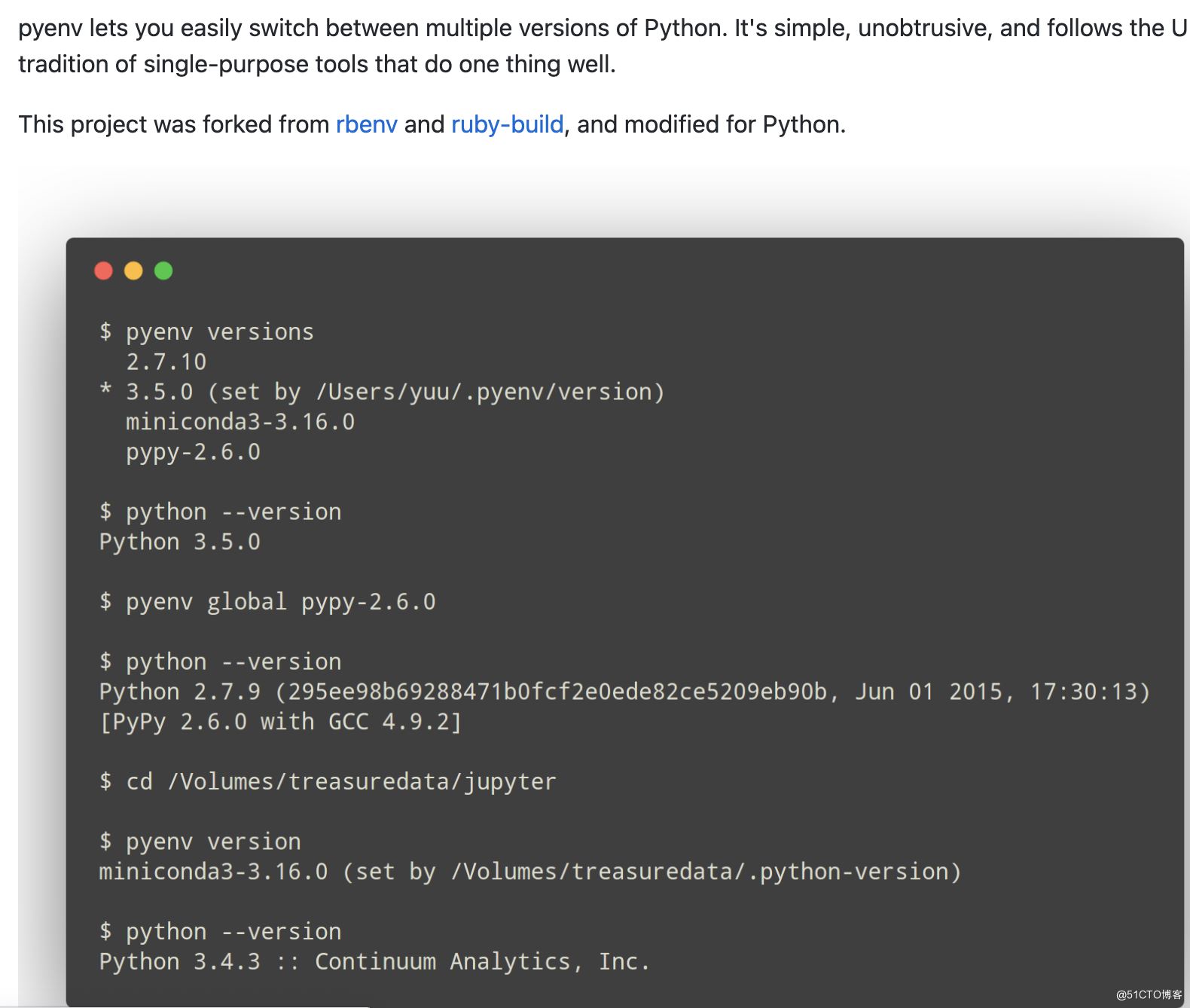 pyenv可以很輕松的下載指定的python版本,可以很輕松的在當前目錄,全局環(huán)境,當前shell中切換到需要的python環(huán)境,我們看下GitHub上對pyenv的介紹,python的虛擬環(huán)境個人也比較推薦pyenv,切換很方便,不用像virtualenv或者其他虛擬環(huán)境一樣麻煩。