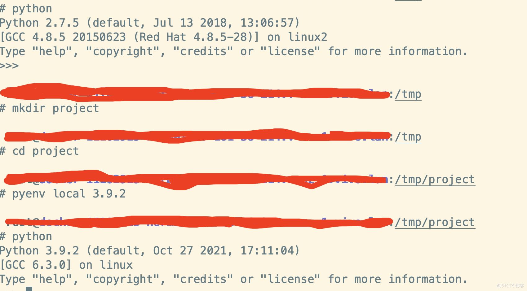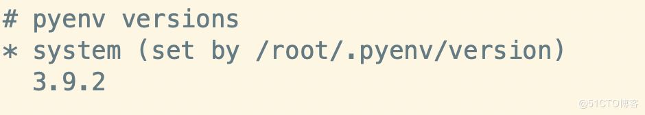 pyenv global 3.9.2//系統(tǒng)整體的切換到python3.9.2的版本pyenv shell 3.9.2//當前的shell會話切換到python3.9.2版本pyenv local 3.9.2//當前目錄路徑內(nèi)切換到python3.9.2版本