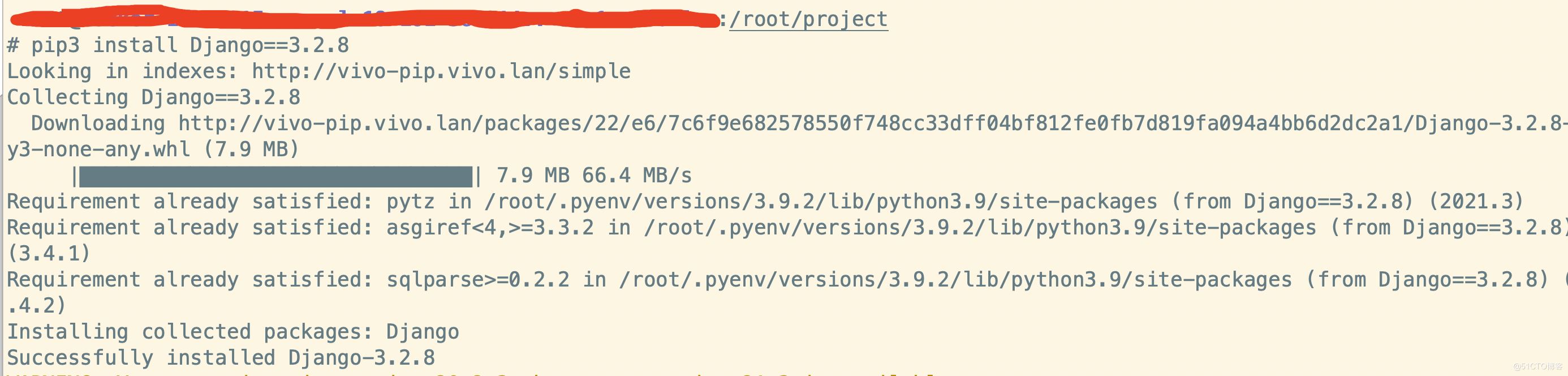 前面我們已經(jīng)安裝了pyenv因此安裝django就會輕松很多,直接使用pip命令安裝即可(注意需要在上面的project目錄里面使用pip3安裝,否則默認使用系統(tǒng)的pip2安裝會有問題的)