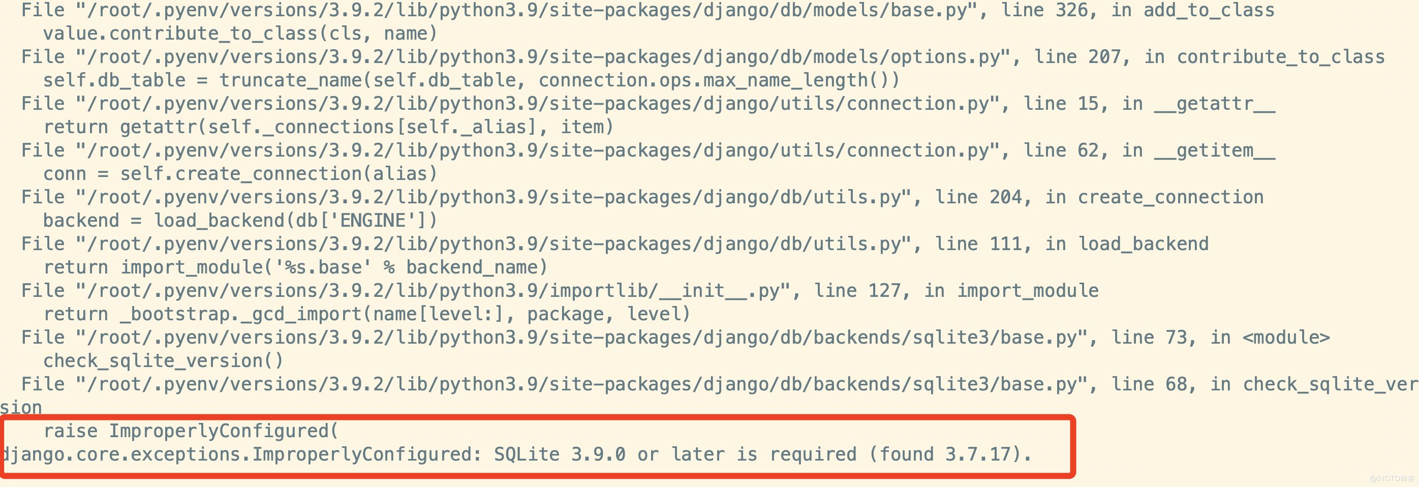 完成之后我們使用django相關(guān)命令會發(fā)現(xiàn)報錯,想不到sqlite3相關(guān)的模塊,這是因為django對sqlite有版本要求(低版本django可能無),因為我們還需要更新CentOS7.3上面的sqlite的版本