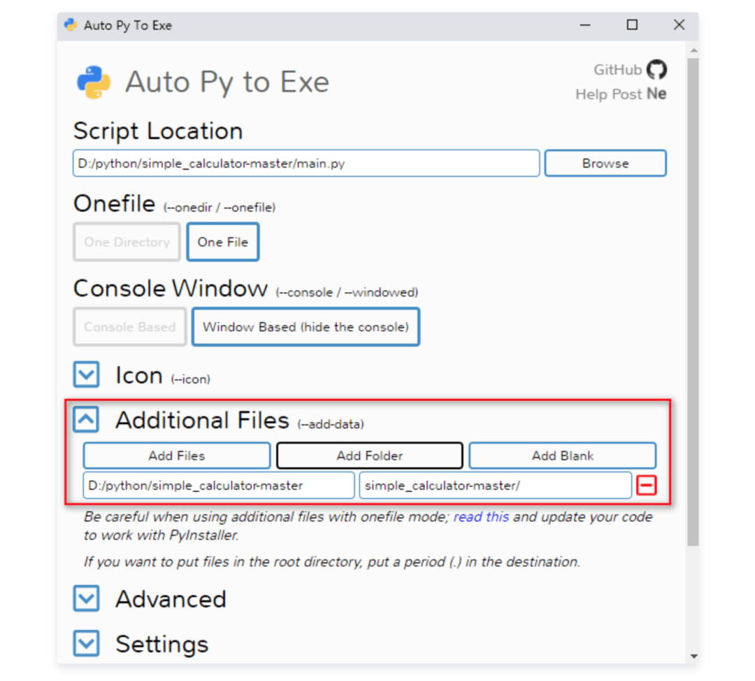 如果程序里面有自己的模塊,我們必須把模塊的目錄添加到 Additional Files 里面。不然會出現(xiàn) Failed to execute script XXX 錯誤