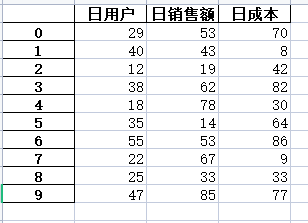 df = pd.DataFrame(data=np.random.randint(1,90,size=[10,3]),columns=['日用戶','日銷售額','日成本'])