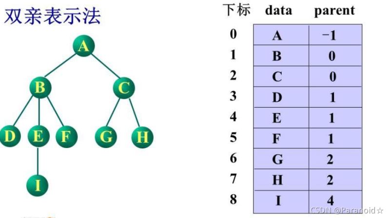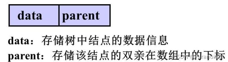 int parent;//指針域,雙親在數(shù)組中的下標(biāo)