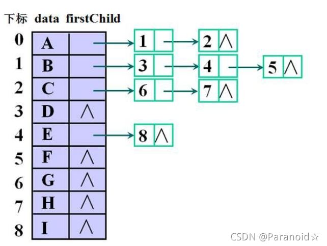 CTNode *firstChild; // 每個(gè)鏈表的頭指針