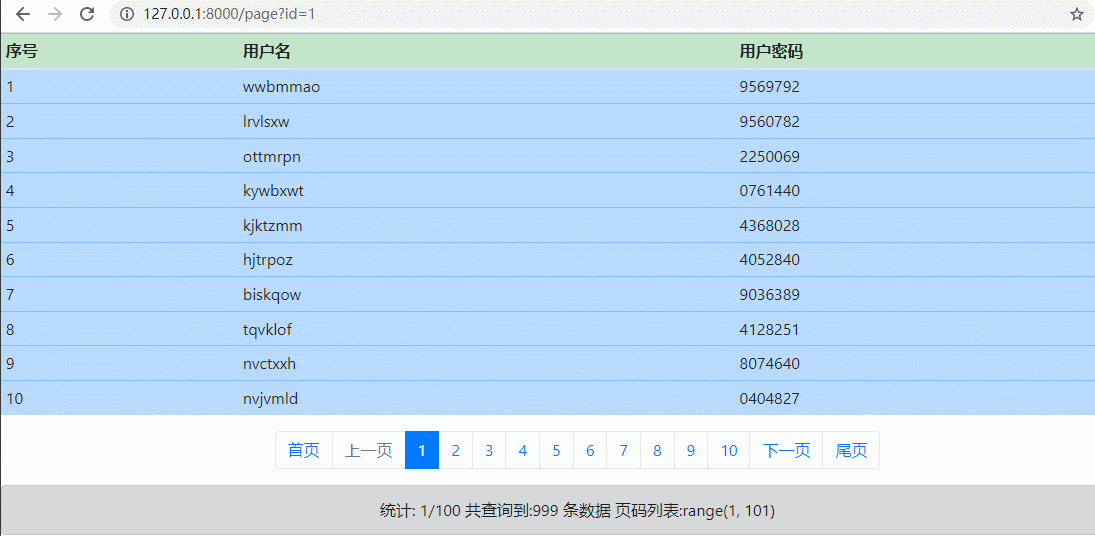 準(zhǔn)備就緒之后,直接訪問http://127.0.0.1:8000/page即可看到分頁顯示效果.