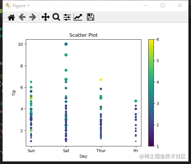 如果我們可以添加顏色并更改點(diǎn)的大小,則此圖會(huì)更有意義。我們可以通過(guò)分別使用 scatter 函數(shù)的c 和 s參數(shù)來(lái)做到這一點(diǎn)。我們還可以使用colorbar()方法顯示顏色條。
