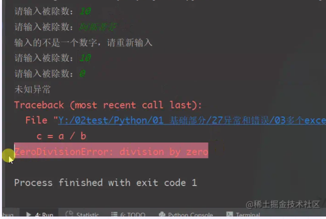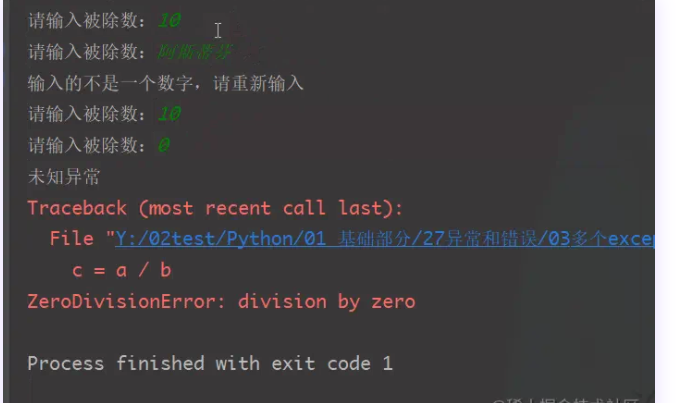 如果想要一個except子句可以同時處理多個異常,這些異常將被放在一個括號里成為一個元組,