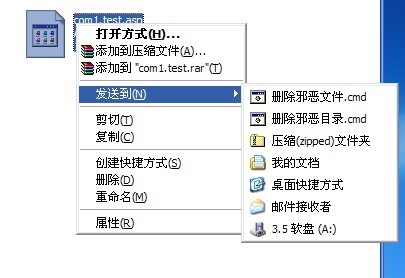 3、找到邪惡的文件,比如com1.test.asp,右擊,選擇發(fā)送到,刪除邪惡文件就可以了。如果是目錄,選擇刪除邪惡目錄。