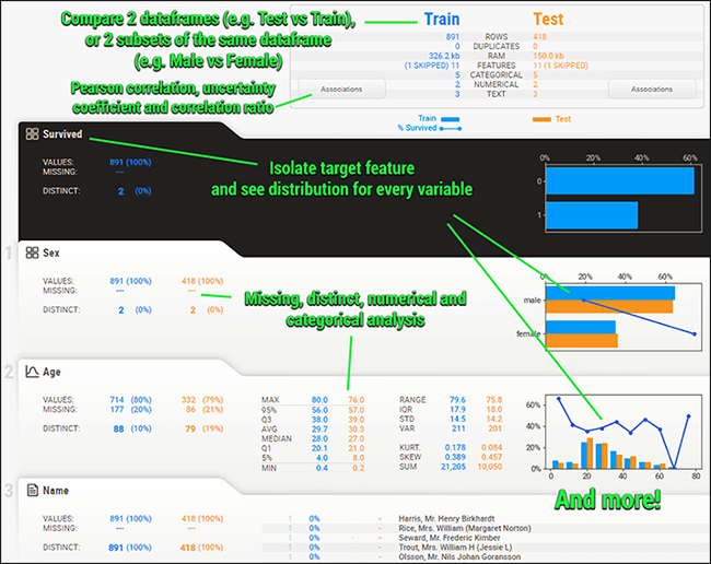 要比較兩個(gè)數(shù)據(jù)集,只需使用該 compare() 函數(shù)。它的參數(shù)與 analyze() 相同,只是插入了第二個(gè)參數(shù)來覆蓋比較數(shù)據(jù)幀。建議使用 [dataframe, “name”] 參數(shù)格式以更好地區(qū)分基礎(chǔ)數(shù)據(jù)幀和比較數(shù)據(jù)幀。(例如 [my_df, "Train"] 比 my_df 更好)